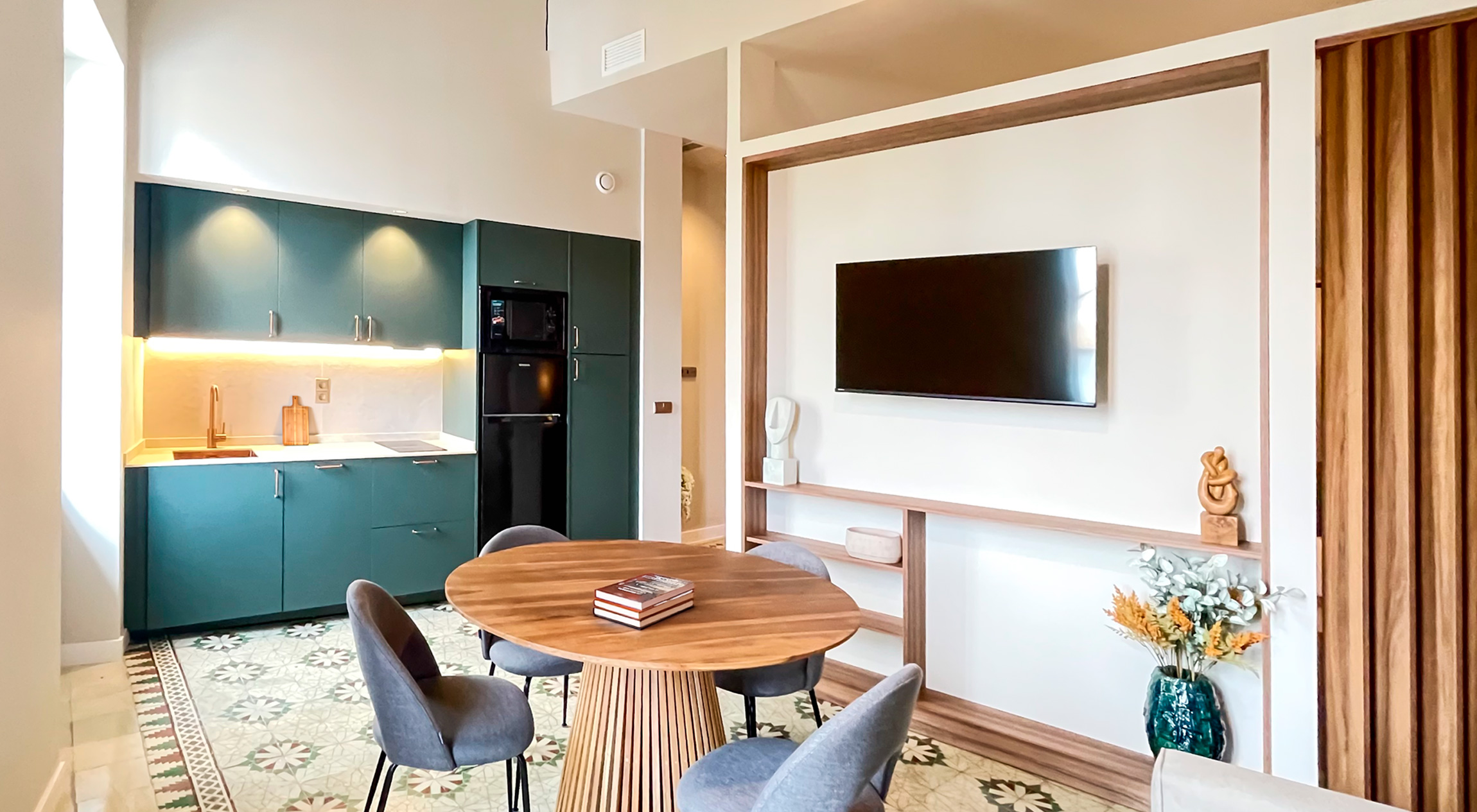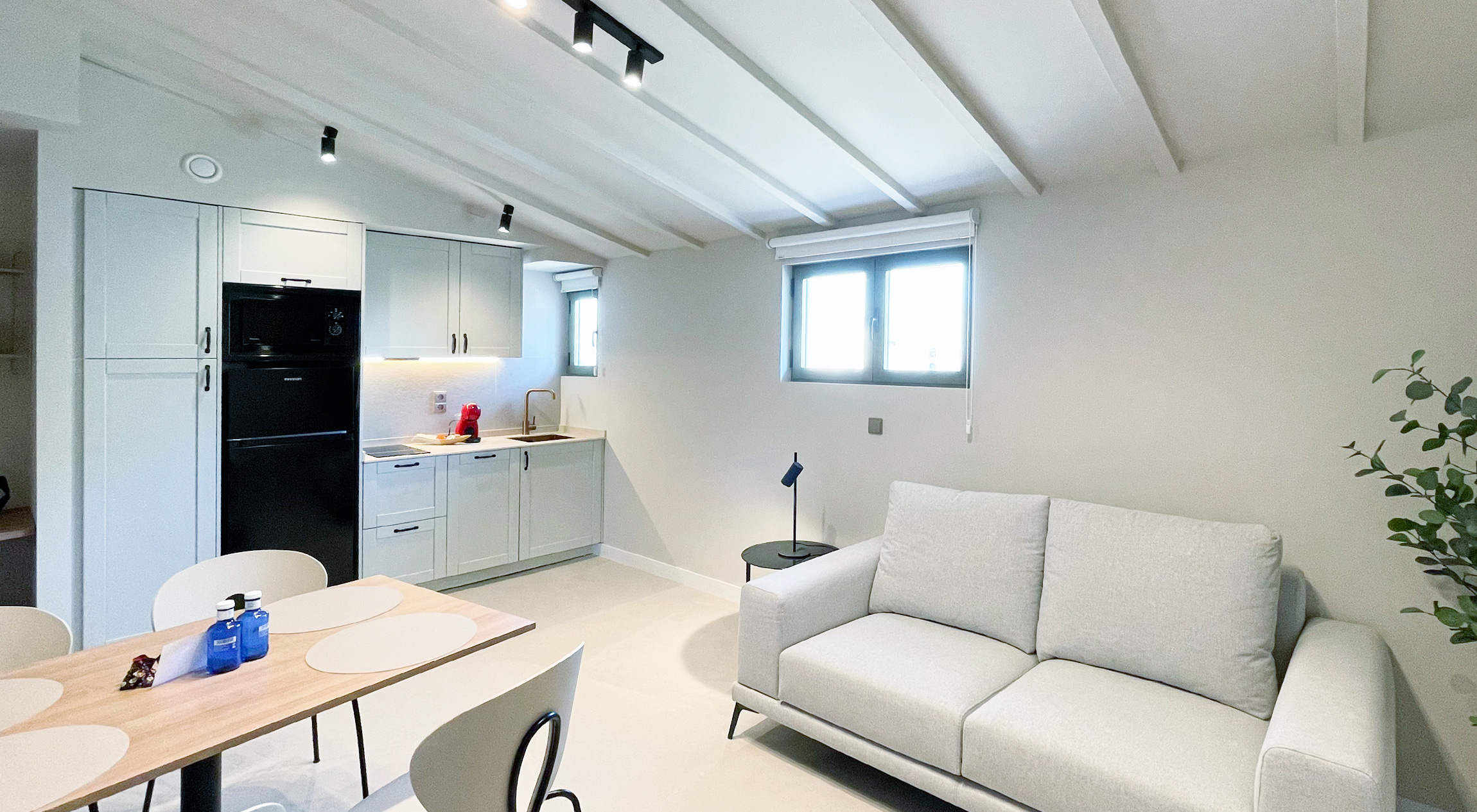 Con capacidad de 2 a 5 personas, estos apartamentos combinan diseño moderno y confort. Sus salones luminosos, cocinas equipadas y distribución versátil los hacen ideales tanto para parejas como para pequeños grupos que buscan una estancia acogedora en pleno centro histórico.